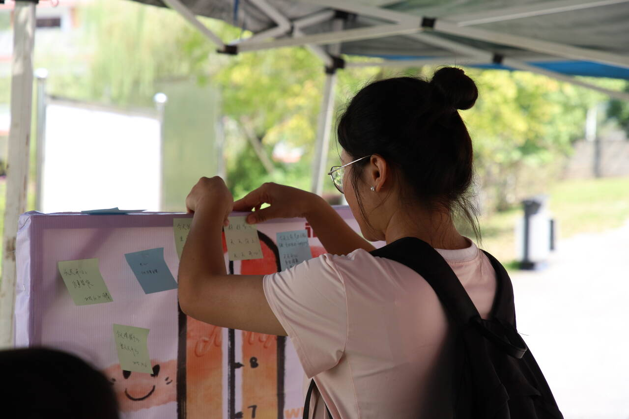学校心理健康协会策划的系列创意互动也在现场同步展开。同学们在“情绪奇遇岛”通过彩色便签记录每日心境,在匿名分享中寻找情感共鸣,从科普手册里学习构建心理韧性的方法;在“接纳大挑战”中,大家认真写下自己的小优点并互相传递鼓励;“镜像模仿秀”则通过双人模仿表情与动作,在笑声中拉近心灵距离,体验“被看见”的温暖,传递自我接纳的积极力量。