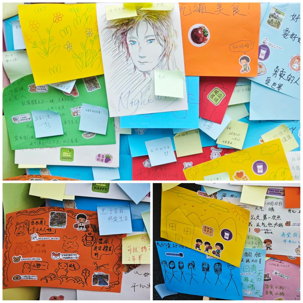 活动现场还充满了协作与创造的温暖氛围。同学们在“协作拼图”中依靠眼神与默契完成挑战,在心理主题“飞花令”中激烈交锋;手工区域则是一片宁静治愈的天地,折纸的专注与手账中记录的“小确幸”相得益彰,展示架上匿名的手账作品与彩虹便利贴上的暖心短评,构成了陌生人之间无声的对话与联结。