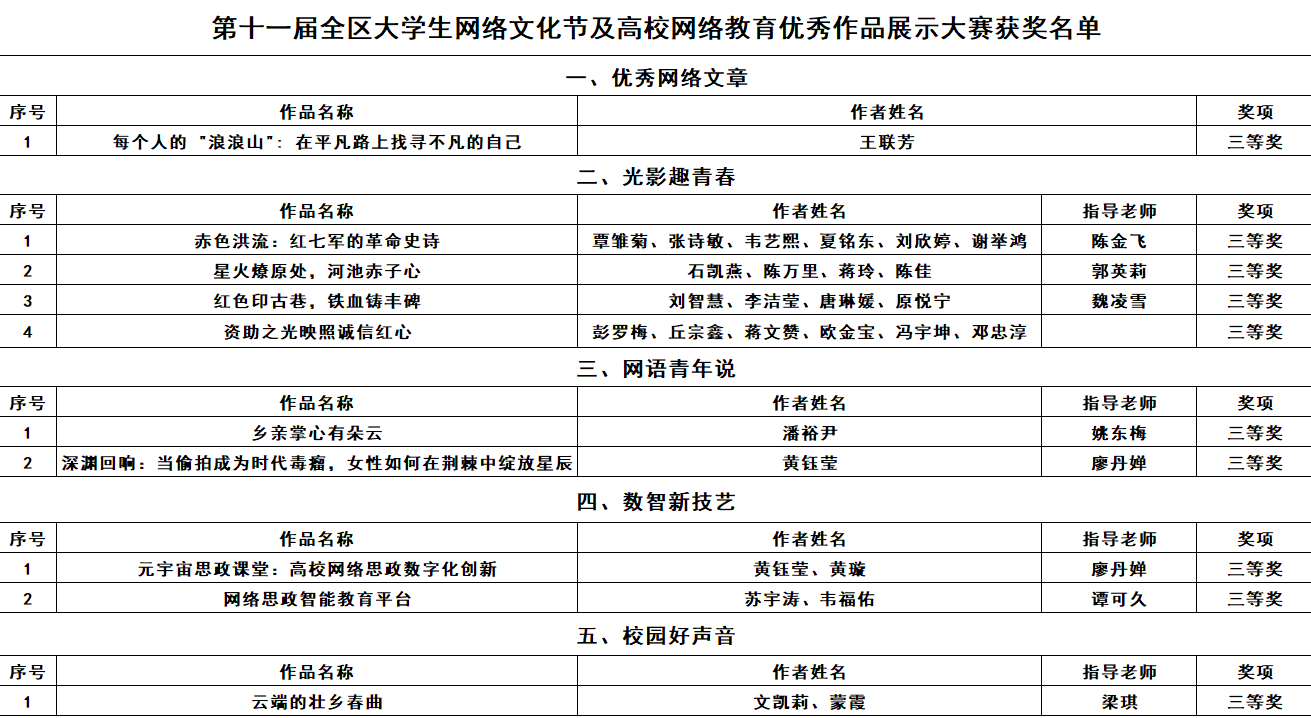 近日,自治区教育厅与自治区党委网信办联合下发《关于公布第十一届全区大学生网络文化节及高校网络教育优秀作品展示大赛获奖名单的通知》(桂教思政〔2025〕17 号)。我校师生创作的10件作品在五大核心赛道中获奖。